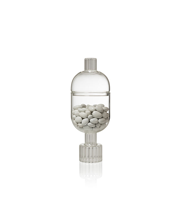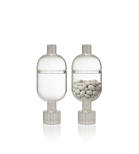 Each vessel is a blown form created without molds using only breath and the skilled hands of Bohemian master craftsmen. The fitted cloche lids complete each composition, their dome forms echoing the curves below.