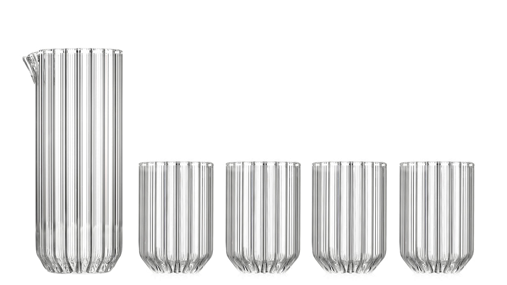 Dearborn Pitcher is a fluted glass pitcher designed by Felicia Ferrone and ideal for serving refreshments of all types, and doubles as a cocktail mixing glass