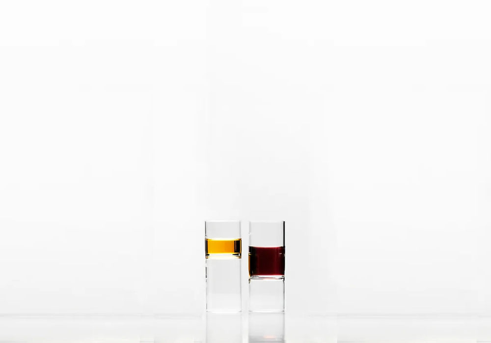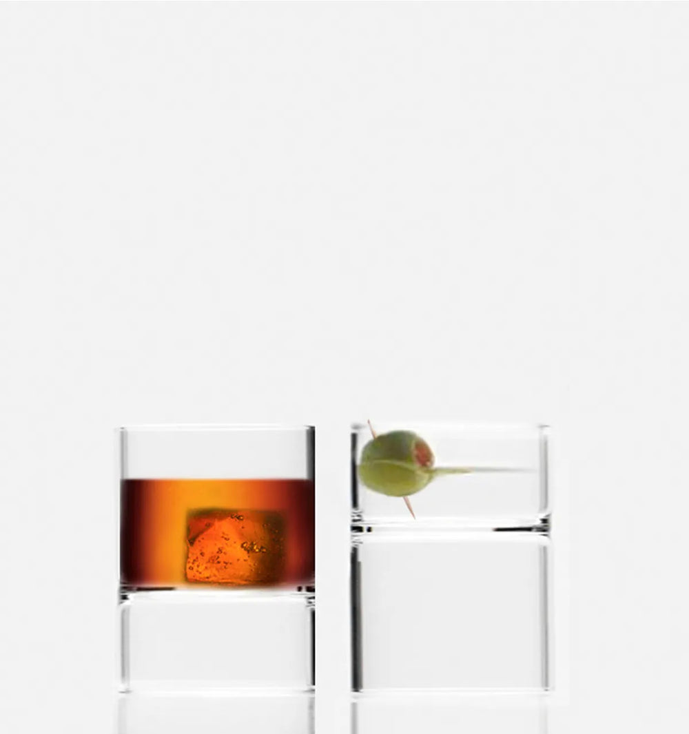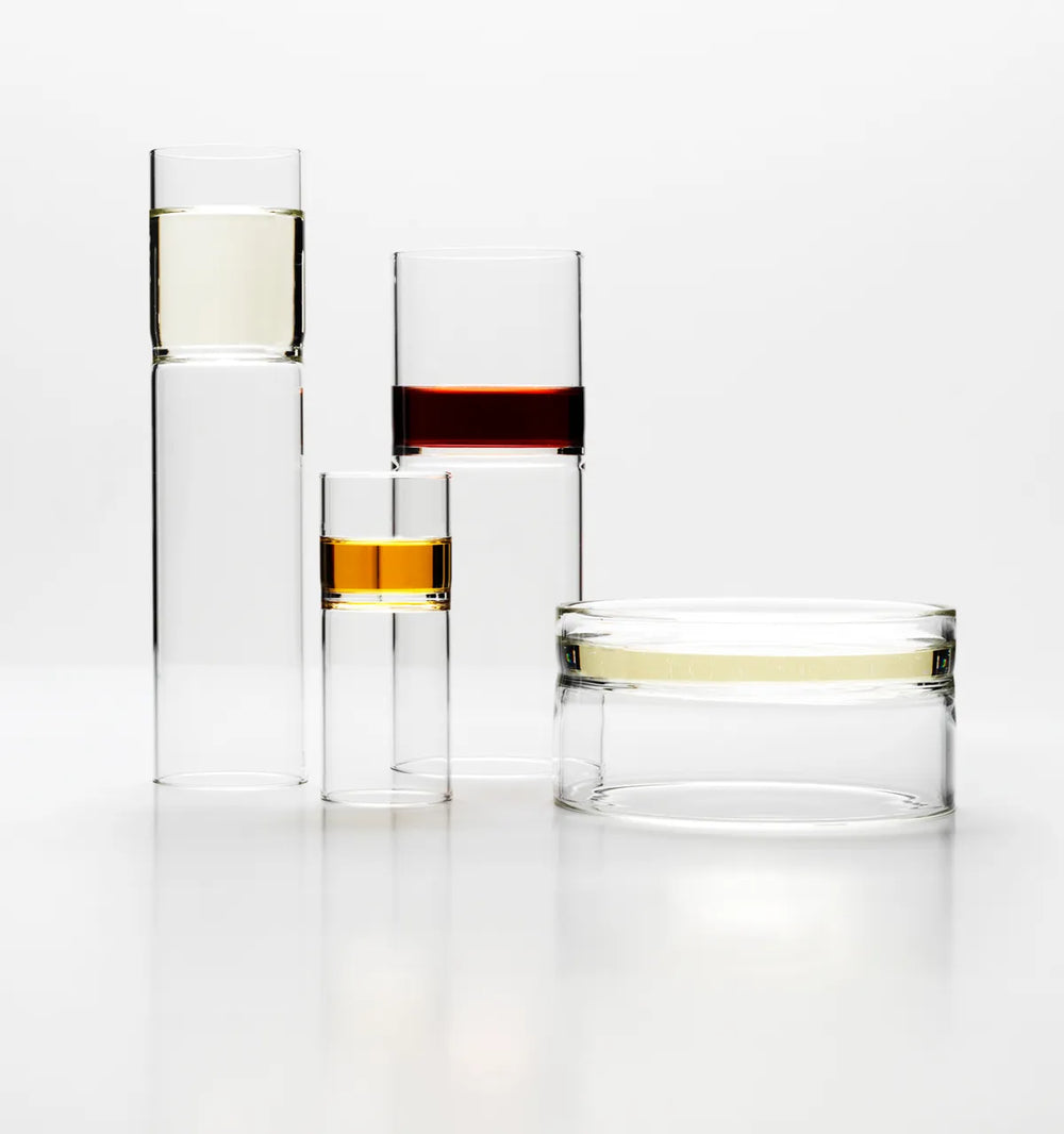 The concept—a flat elevated base formed by the connection of two cylindrical volumes—was achieved through the first use of borosilicate glass in a designed object for the domestic environment. Each piece is produced without the use of molds in the Czech Republic. Discoveries made during production led to ongoing experimentation and further lines of glassware—all industrially produced yet handcrafted by master artisans.