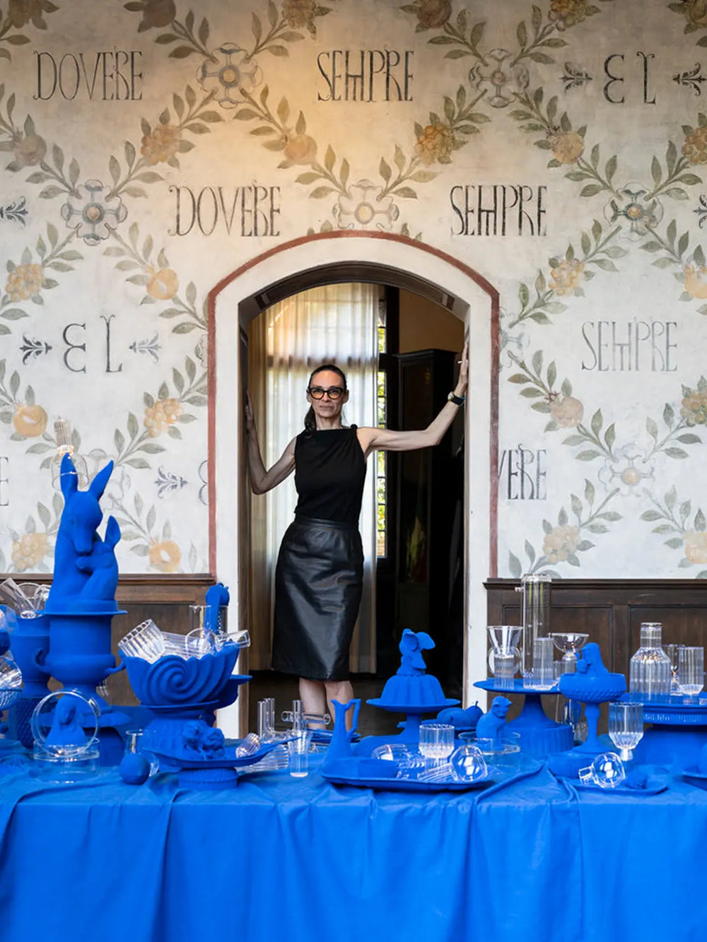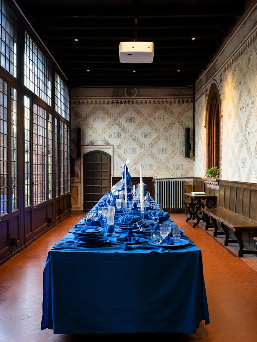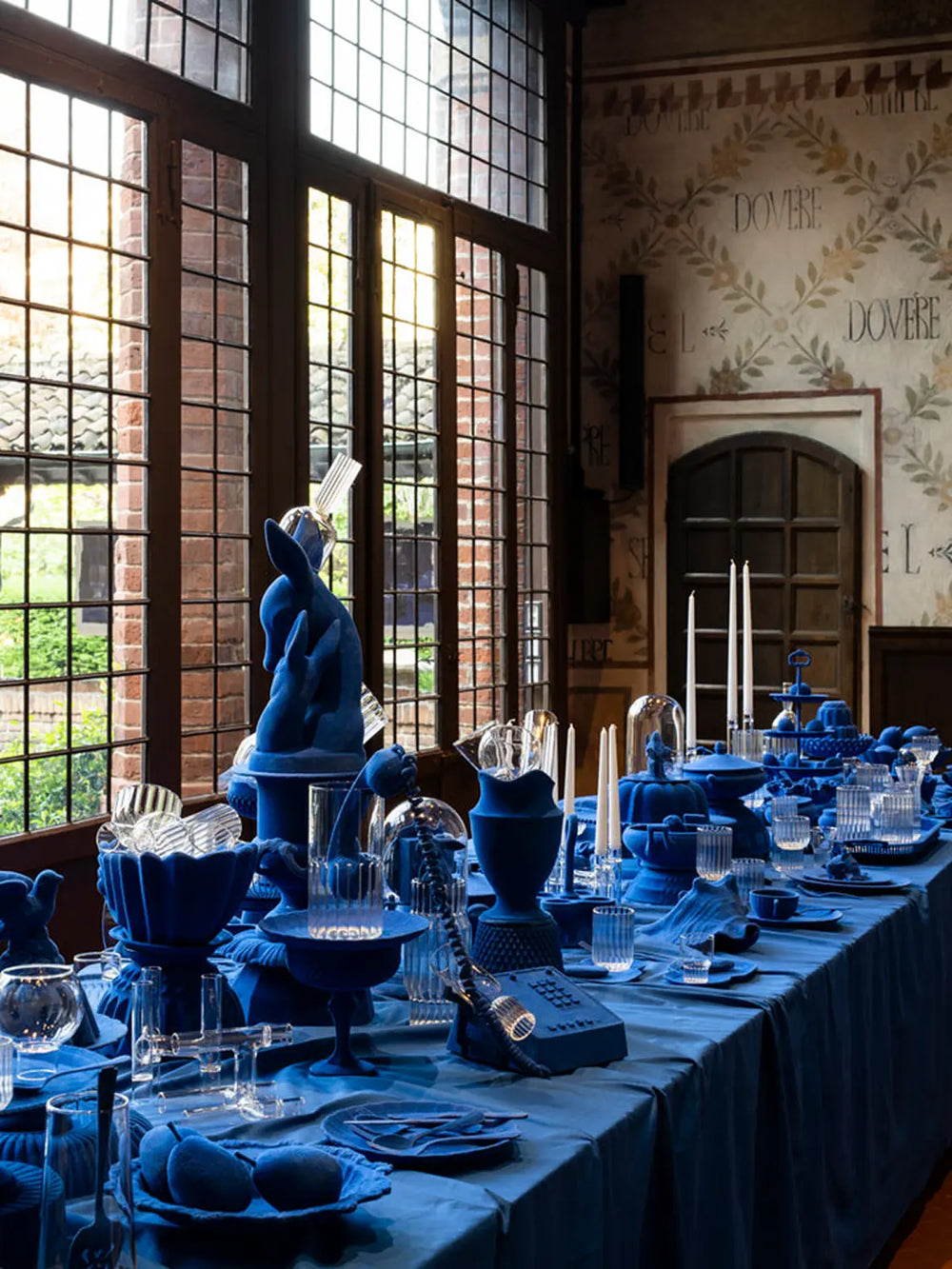 STILL NOW. The Dinner at Villa Mirabello unfolds in a monochromatic installation where everyday objects, enveloped in the iconic ultramarine hue, are distilled down to the essence of their form. Ferrone's glassware creations, contemporary in design, often characterized by some as reminiscent of the past and to others seen as futuristic, emerge from the monochromatic landscape in dialogue, proposing new ways of being through recontextualization and contemporization.